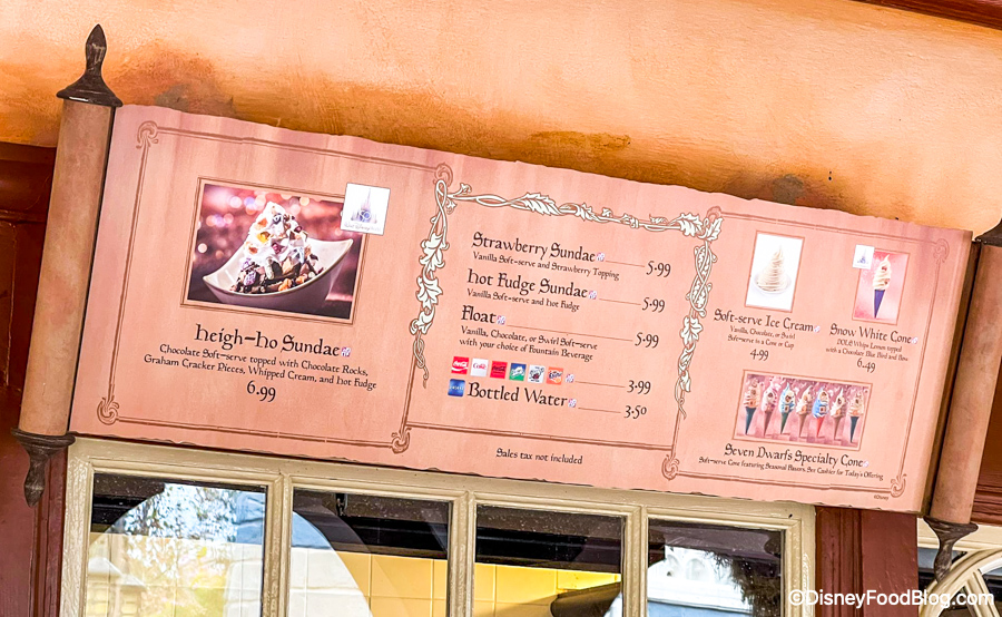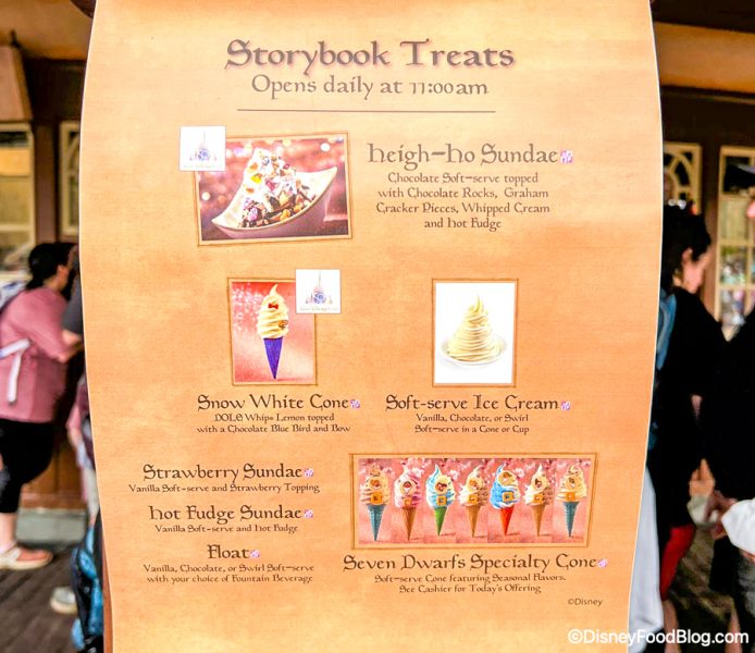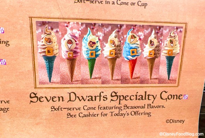 So, if you’re over in Magic Kingdom, you just have to ask a Cast Member at Storybook Treats if the featured cone for the day is themed to Grumpy, Dopey, Doc, Happy, Bashful, Sneezy, or Sleepy! Today, the cones were still themed to Grumpy, but there will be a new one tomorrow.