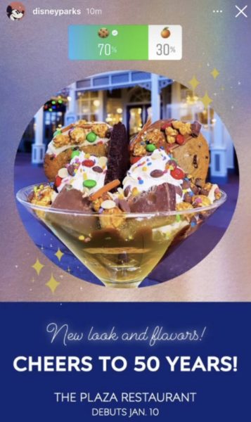 We’ve already checked out the Slue Foot Sue Fish Sandwich and the Donald Duck Dome Cake. Now, we’re heading over to Plaza Restaurant in Magic Kingdom to take a look at their UPDATED Cheers to 50 Years ice cream sundae.