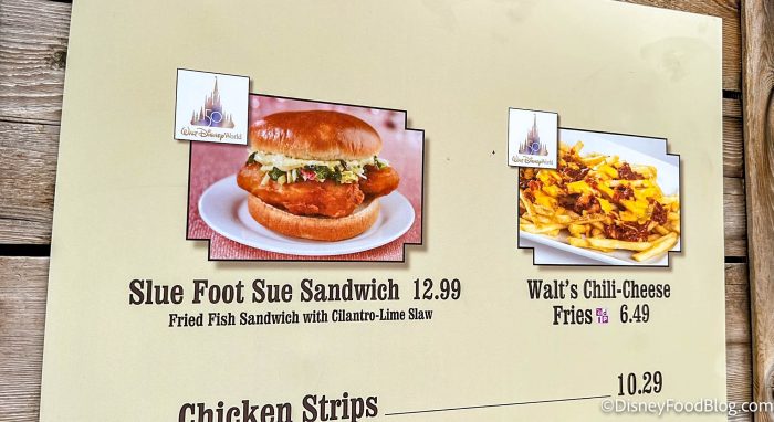 Today we visited the Golden Oak Outpost in Magic Kingdom to try the NEW Slue Foot Sue Fish Sandwich! You might be asking, what kind of name is that?! Well, it’s based on a character known as Slue-Foot-Sue from the 1948 film Melody Time. She’s a cowgirl and the love interest of Pecos Bill! Normally we wouldn’t want the word “foot” in a food name, but we’re giving it a try.