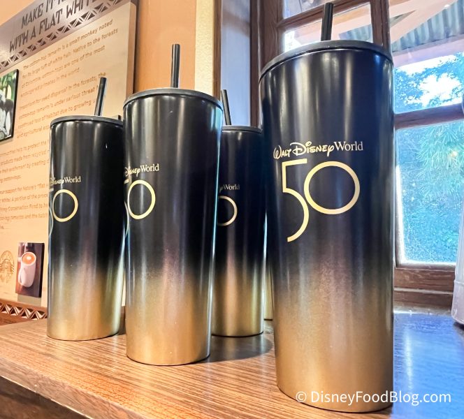 We found the newest Starbucks souvenir drinkware in Disney’s Animal Kingdom. Over at Creature Comforts (where you’ll find your favorite Starbucks beverages available for purchase), we ran across the newest 50th Anniversary Celebration black and gold tumblers…