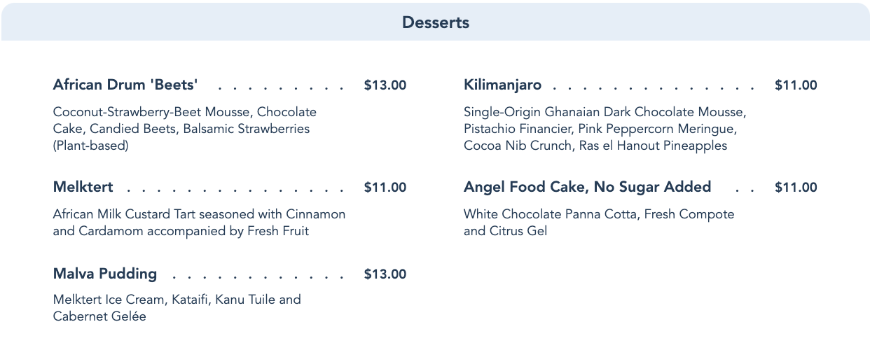 Still hungry? Jiko’s Dessert menu will include Malva Pudding for $13 and African Drum ‘Beets’ for $13.