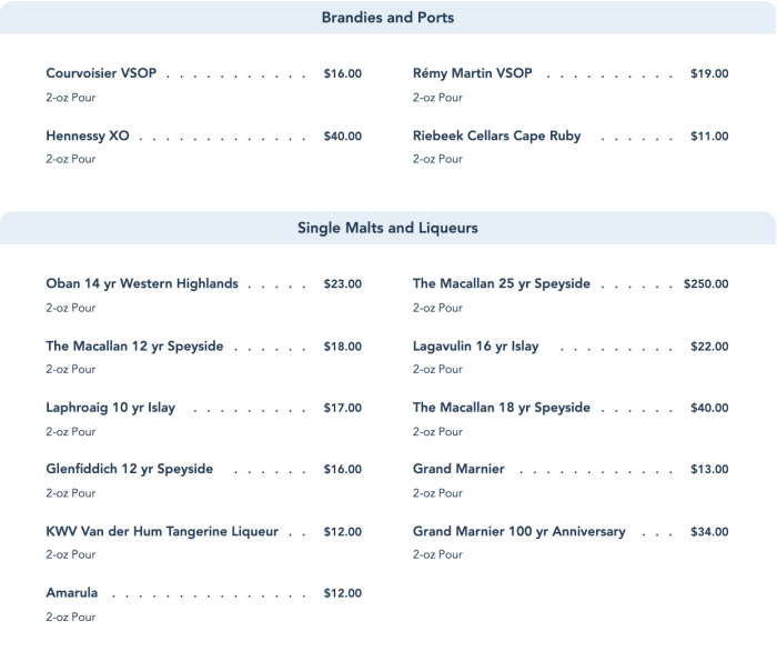 Finally, Jiko’s reopening menu includes a variety of Brandies, Ports, Single Malts, and Liqueurs to enjoy alongside your meal.