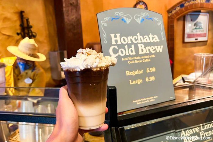 This is the new Horchata Cold Brew from Rancho del Zocalo in Disneyland Park! It’s iced horchata and cold brew topped with whipped cream and cinnamon.
