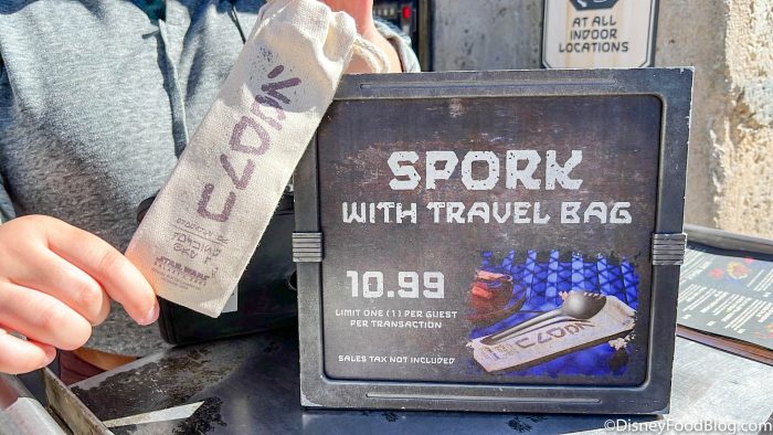 These babies have a complicated past. At first they were available for guests to use at Docking Bay 7. They then experienced some problems when guests didn’t exactly want to part ways with them after eating. The sporks were taken away and regular utensils were put in their place. But they then became available for guests to purchase. This is similar to the pattern of events that took place in Disneyland when their version of Galaxy’s Edge opened.