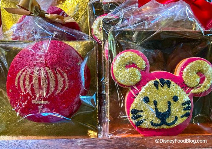 Back on the sweet side of things, we found these Mickey-shaped Tiger cookies! There are two different sugar cookies, both dipped in red chocolate with gold details. Both new cookies are available for $9.