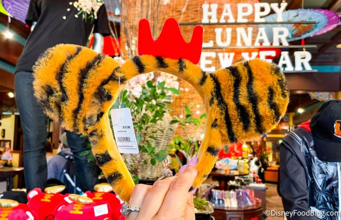 Earlier this year, we found some gorgeous Lunar New Year Minnie Ears, which were red with embroidered flowers and pearl accents. But these aren’t the only ears you can find to celebrate the occasion now. Over in EPCOT, we spotted (er…striped?) some new Tiger ear headbands!