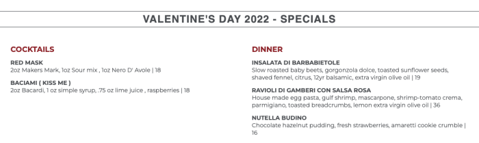On Valentine’s Day, this spot will have the same special menu as Maria and Enzo’s Ristorante, with the Insalata Di Barbabietole, Ravioli Di Gamberi Con Salsa Rosa, and Nutella Budino all offered here as well.
