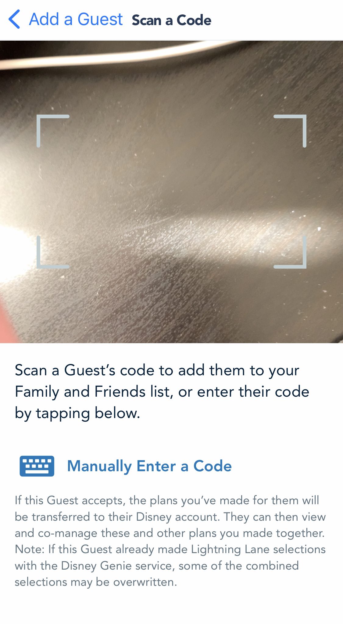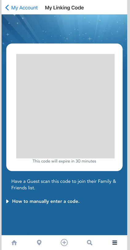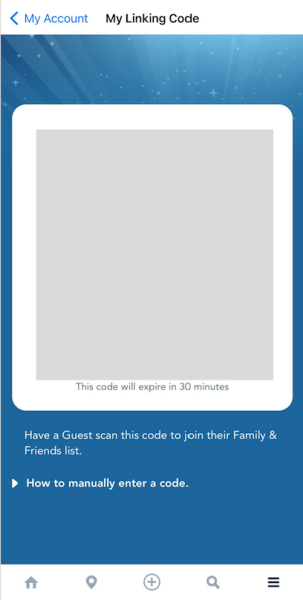 Once you’re there, go to “Show My Linking Code.” Disney will then prompt you with a warning explaining what the linking code is. Essentially it is a QR code. Once someone scans your Linking Code, you’ll be added to their Friends & Family list.