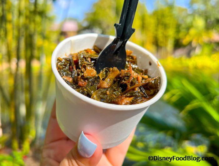One of those food offerings is some classic side dish! It’s Collard Greens, which are tossed with Bacon (because bacon makes everything better, right?). And yes, we dove right on in. First up, we do have to admit this is NOT our Grandma’s collard greens, but Disney got pretty close here.