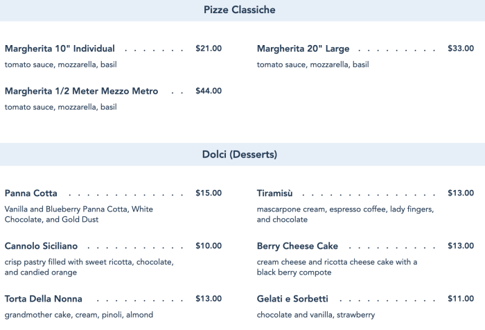 - You want a table service meal to break up your typical EPCOT festival eats or snacking around World Showcase. But be warned that you could fill up here. If you want to keep snacking, consider just ordering a pizza and skipping on the appetizer and dessert.
