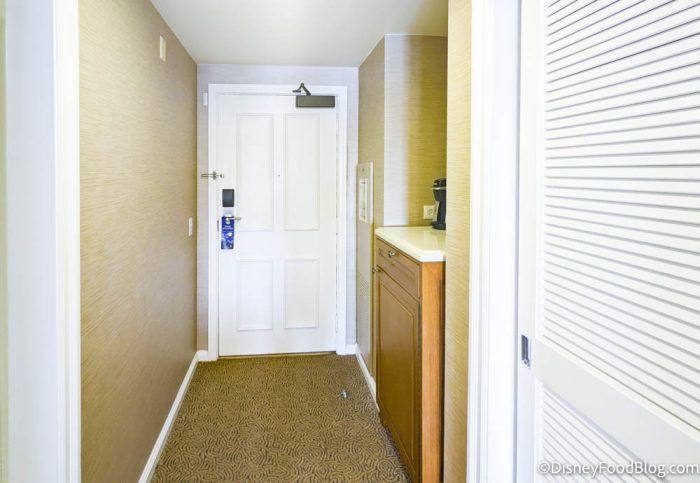 Now let’s head inside the room itself! We got a normal room with a standard view. There’s a short hallway right inside the entrance with a morning bar area, a closet, and the bathroom on either side.
