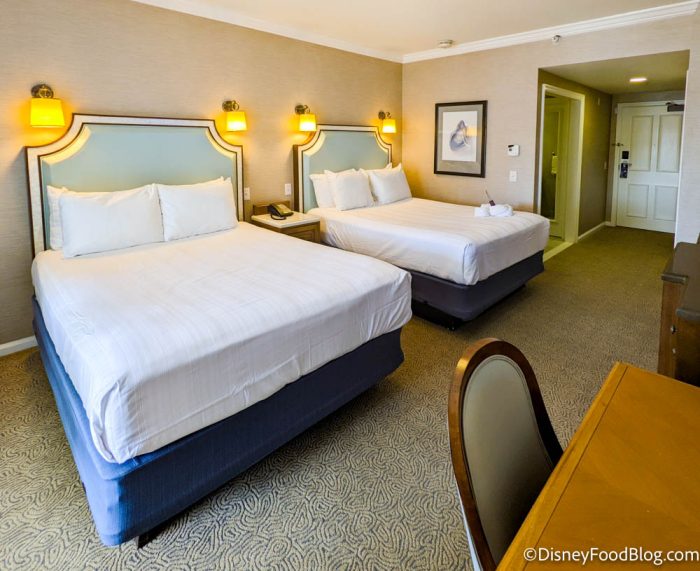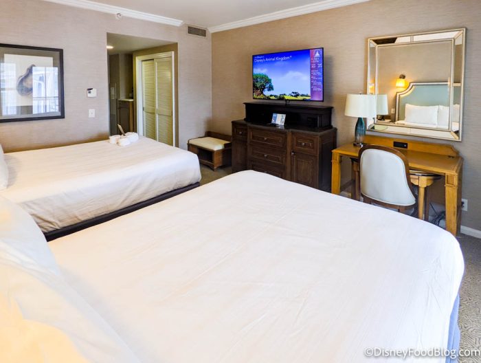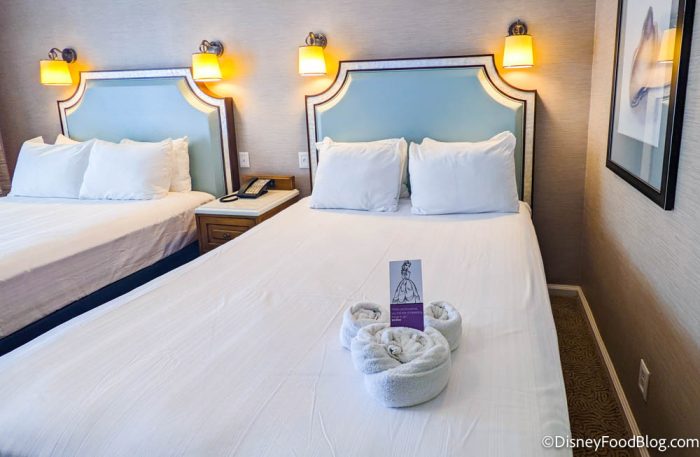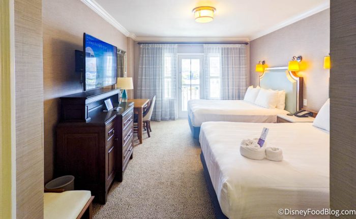Now we’re heading to the EPCOT area to tour another Deluxe hotel over there. There’s actually a pair of fancy hotels right next to each other, and Disney calls them “sister hotels.” Today, we’re taking a look at the “fun” sister in this pair, although you’ll probably agree with us that it still looks like a very upscale experience. These rooms aren’t quite as pricey as the Grand Floridian, but they’re not far off. But you can head inside with us now for FREE to take a look at these rooms!