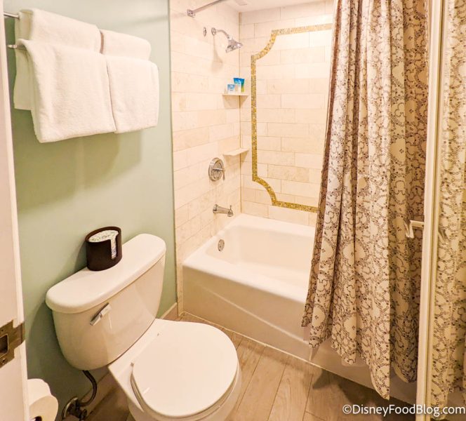 …and a shower/tub combo. Four towels are hanging up in this room, and don’t forget the extras that we found under the sinks.
