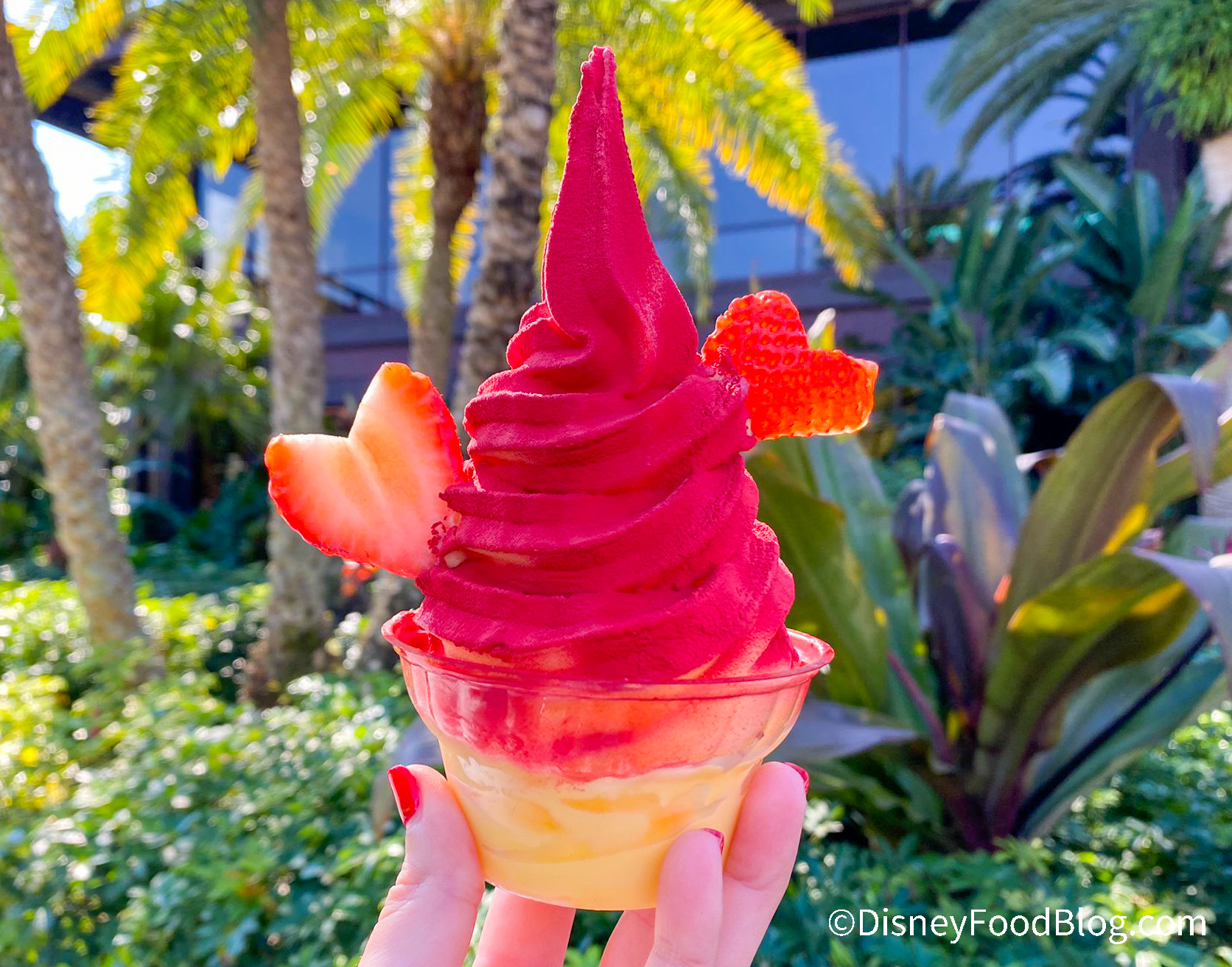 If you head to Pineapple Lanai at Disney’s Polynesian Village Resort, you may not see a sign for the Red Pineapple Heart Dole Whip (that’s the name it rang up under) — but it IS something you’ll be able to get for a limited-time. This is basically a regular Dole Whip with whatever flavor you choose (we chose classic Pineapple).