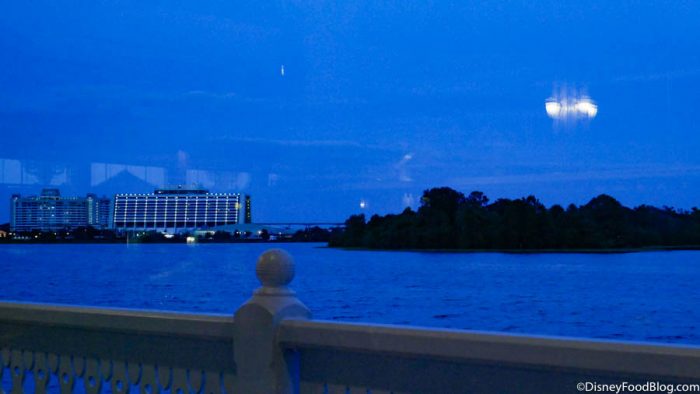 The dining room at Narcoossee’s is laid out like a wraparound porch, with tables surrounded by huge windows. You’ll be able to watch the fireworks over the Cinderella Castle from this dining room, especially if you’re sitting at a table right beside the windows (some are further in). We actually kinda like the tables further in from the windows, because there’s less glare from the reflection of the dining room lights on the windows.