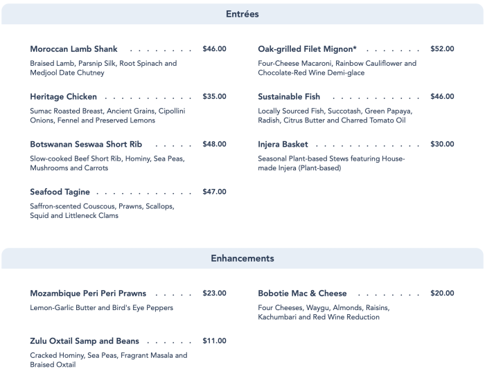 On the entrée menu, you’ll find a variety of meat, seafood, and plant-based options. Keep in mind that the entrées are priced along the lines of a signature dining experience. In terms of options, guests can choose from things like the Moroccan Lamb Shank, Oak-grilled Filet Mignon, Heritage Chicken, Fish, and more! Guests can also add three additional enhancements that range in price from $11 to $23.