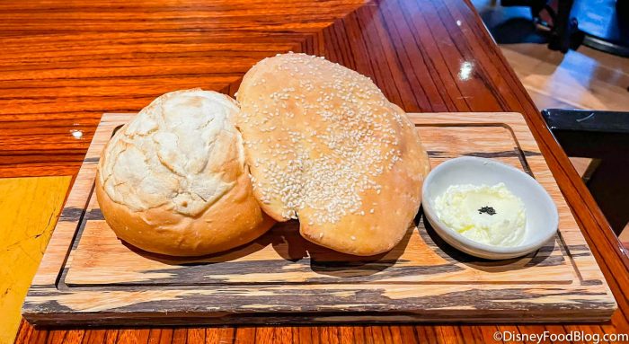 We started with two small loaves of bread, including giraffe bread and Egyptian sesame bread. The giraffe bread was the larger white loaf, which you’ll see was topped with rice flour to give it a fun giraffe print (we are at ANIMAL Kingdom Lodge, after all!). The thinner loaf was the Egyptian sesame bread, which we found to be a little harder and denser than the giraffe bread. Both we SO good, though — our bread was nice and fresh!