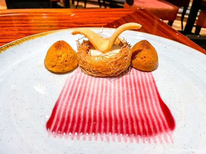 These desserts looked like art! Our Malva Pudding, made with Melktert Ice Cream, Kataifi, Kanu Tuile, and Cabernet Gelée, was the autumn dessert of our DREAMS! Our server told us that the sauce on the plate was made to resemble the crops that the Kanu bird (from before!!) flew over to bring good luck.