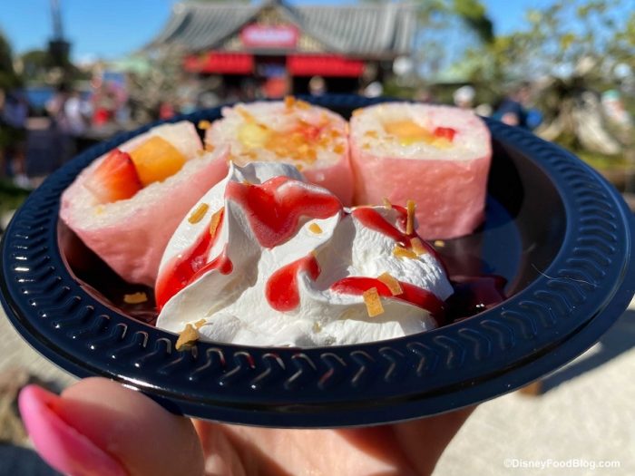Also returning is the Frushi at Hanami in Japan! This is strawberry, pineapple, and cantaloupe wrapped in sweet rice and pink soy wrap served with whipped cream, berry sauce, and toasted coconut.