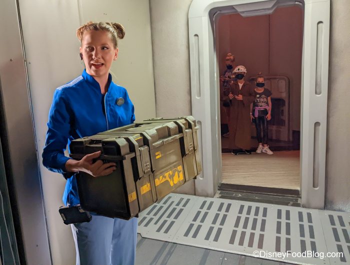 We waited just a couple of minutes for a transport to arrive to take us back to the Halcyon. We scanned our band and headed to board our transport, but one more mission was waiting for us before we boarded. A Cast Member met us with a crate and asked us to make sure we got it the next Cast Member we met onboard the ship. And so our next mission began… .