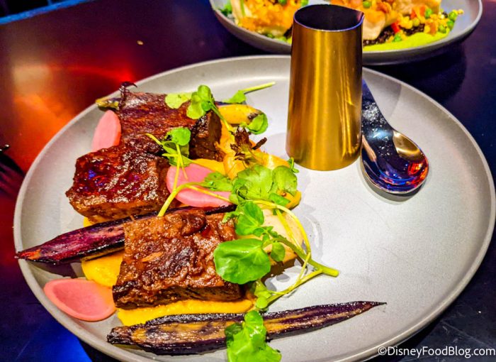 First up we have the Braised Bantha Beef Short Rib. This was served with a rich fig fruit demi-glace, tuber-tumeric puree, and nightshade flora. This was pretty good, but not quite as good as the Bantha Beef Tenderloin we had during night 1’s dinner. This was still perfectly cooked, but it fell apart more like a pot roast. Don’t get us wrong, it was still flavorful, moist, and tasty — but night 1’s Bantha Beef was the winner here.