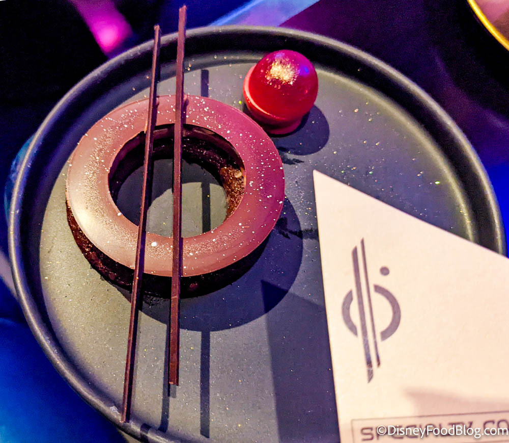 What’s cool about this dessert is that it basically makes the shape of the Chandrila logo. It might seem simple, but we loved the design of this dessert and how tied into the ship’s story it is! (It was also very space-looking, which was great!).