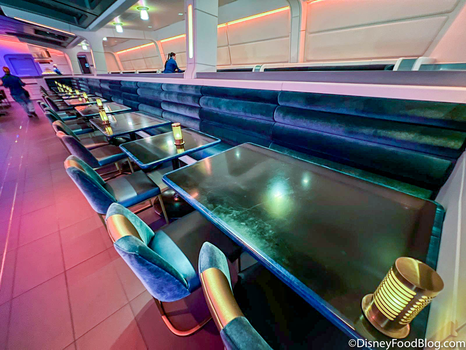 The entire space feels elevated but still fun — like a supper club made for the finest space folks. The chandeliers/light fixtures in the space are incredible! They are colorful and truly look like something out-of-this-world.