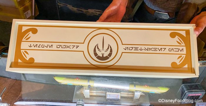 We laugh because for the past few days we’ve been in Star Wars Hotel land, getting ready to share our experiences with you. Today we got to reveal all kinds of details about the experience, including reviews of the food we ate, a look at the merchandise you can buy onboard, what the fireworks looked like, and more. But there’s some more news to report from Batuu (a.k.a. Star Wars: Galaxy’s Edge at Disney’s Hollywood Studios). Specifically, today we found a NEW Star Wars item that is SO fancy, you’ll have to buy it before you’re allowed to even hold it!