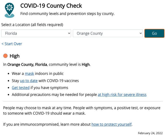 On that same CDC site, you can check to see the community level by state and county. Both Orange County, Florida…