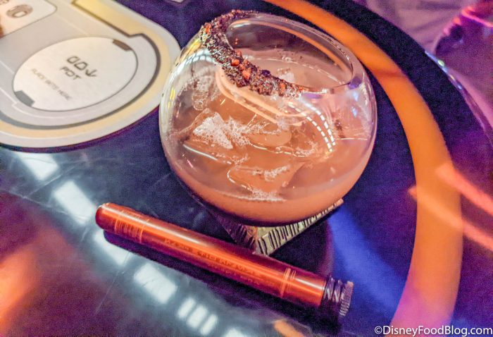 During another part of our trip (while at the Crown of Corellia Dining Room) we also got to try the Dagobah Vimlet, but we wanted to make sure we included it here so you could get our full thoughts (since it is also something you can get at Sublight Lounge). At Sublight Lounge, you can get this drink for $15. It is made with vodka, herbaceous orange liqueur, lime, and peppercorn, and is essentially like a vodka gilmet.
