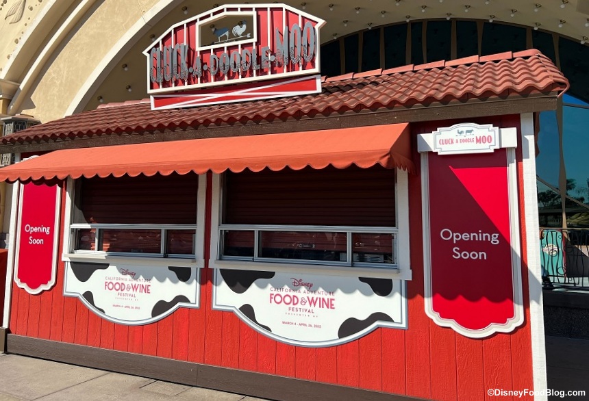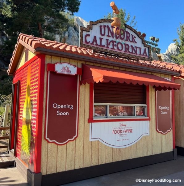 While we were strolling around Disney California Adventure, we noticed that the FIRST food booths have officially appeared with big “Coming Soon” signs. First, we found the Uncork California Booth, which as its name suggests, is all about California wines and their cheese and dessert pairings.