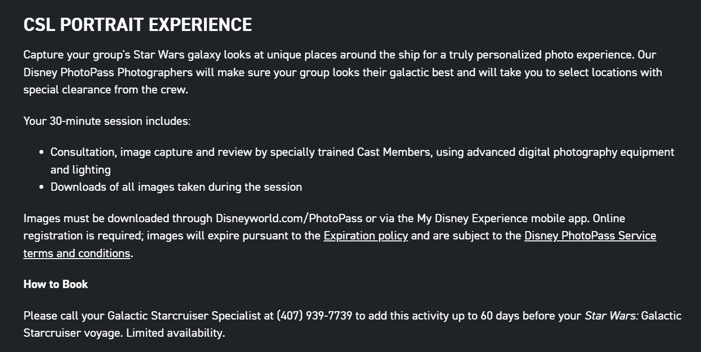 Passengers staying at the Galactic Starcruiser can now add the Disney PhotoPass CSL Portrait Experience to their two-night adventure on the Halcyon (CSL stands for Chandrila Star Line, the starcruiser’s operator known for its fleet of glamourous starcruisers). This is a PhotoPass Capture Your Moment experience that lets you book a private photo session with your very own Disney PhotoPass photographer.