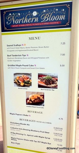 Right next door in Canada, we saw the menu was up for the Northern Bloom booth! There are returning items over here like the Seared Scallops for $7.25 (previously $7), Beef Tenderloin Tips for $7 (previously $6.75), and the Griddled Maple Pound Cake for $5 (previously $4.75)…