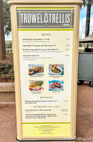 We first noticed menus up at the Trowel and Trellis booth over in the World Showcase Plaza! There are returning items on the menu like the Impossible Sausage and Kale Soup for $5.25 (previously $5) as well as new items like the Chocolate Cake for $4.75.