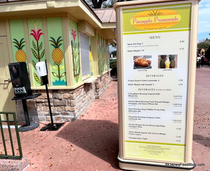 Nearby is Pineapple Promenade! This booth will see the return of the Spicy Hot Dog for $8 and the DOLE Whip for $5.75 (previously $5.25).