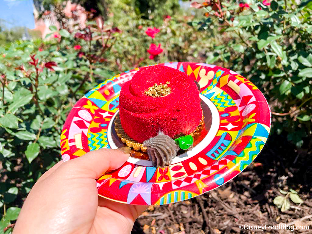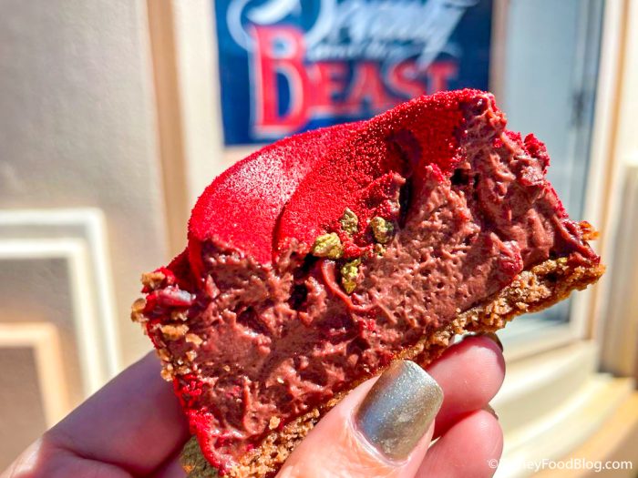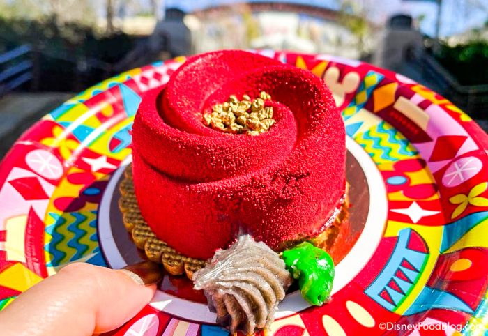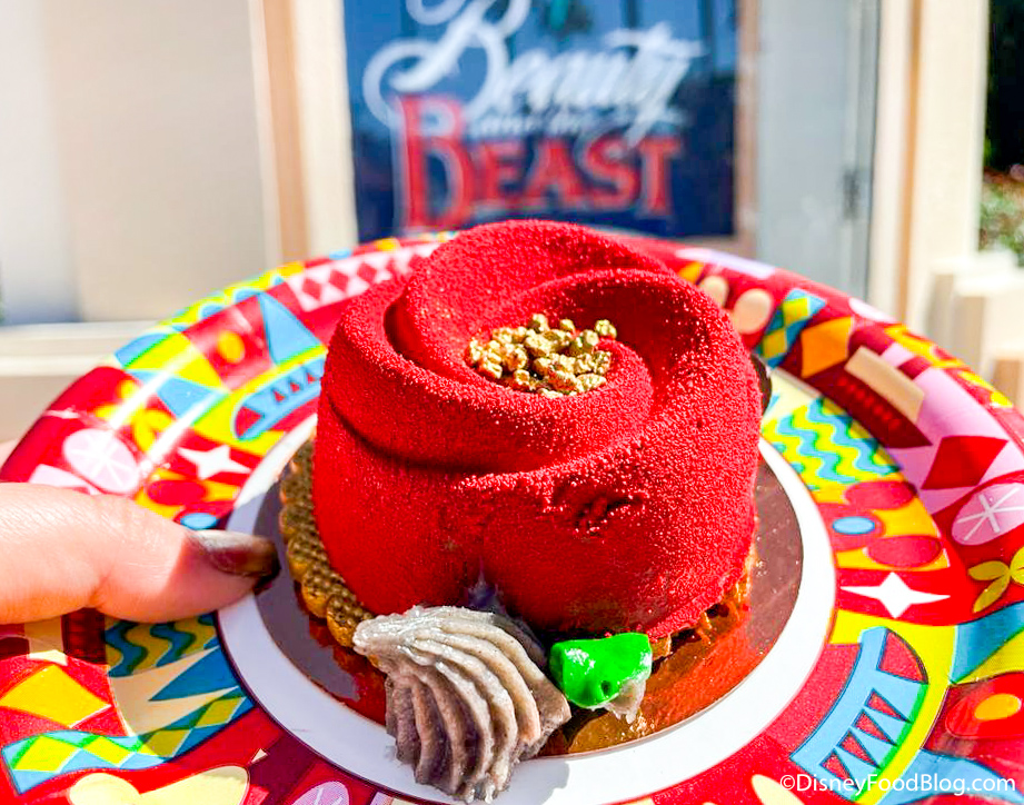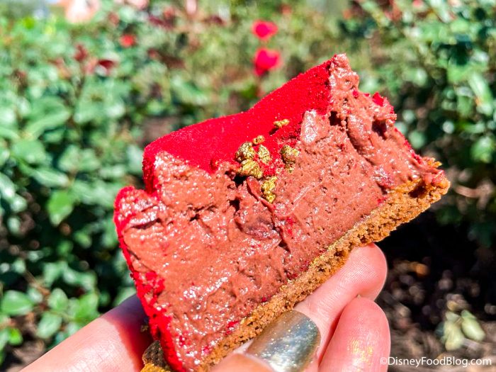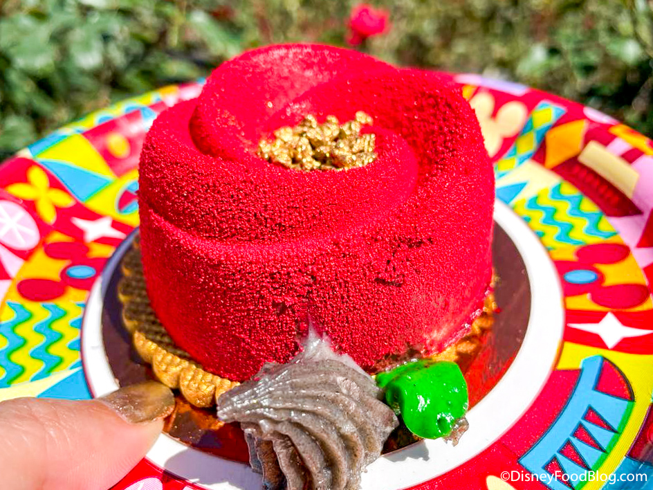 This is the new Enchanted Rose! It’s a Beauty and the Beast themed treat that has Dark Chocolate Mousse with a taste of Blackcurrant and Morella Cherry-Chocolate Shortbread Cookie with Whipped Cookies ’n Cream Fluff and gilded Chocolate-covered Cacoa Nibs.