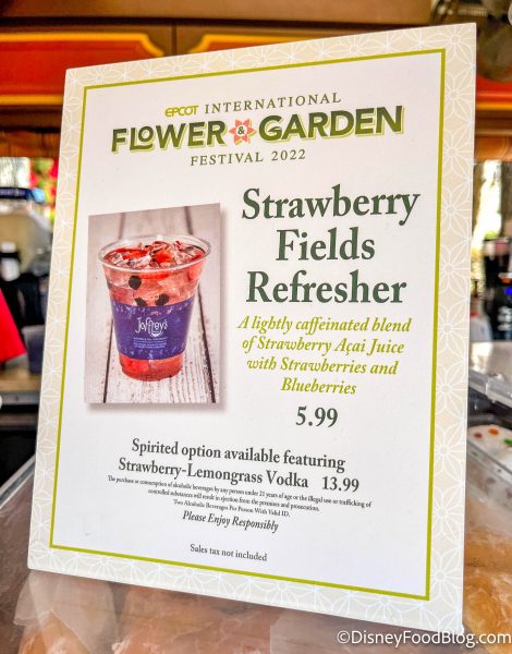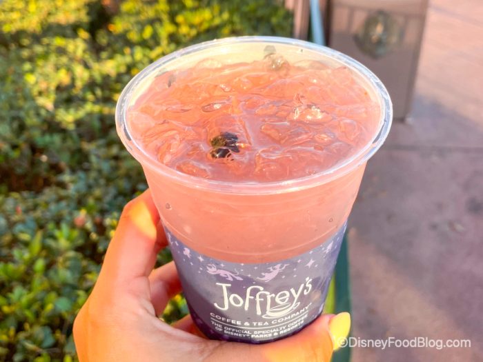 The Joffrey’s location near the Canada pavilion in World Showcase has a Strawberry Fields Refresher, which is a lightly caffeinated blend of strawberry açaí juice with strawberries and blueberries. You can add Strawberry-Lemongrass Vodka if you’d like as well. The non-alcoholic version is $5.99 or it’s $13.99 if you want to add the vodka.