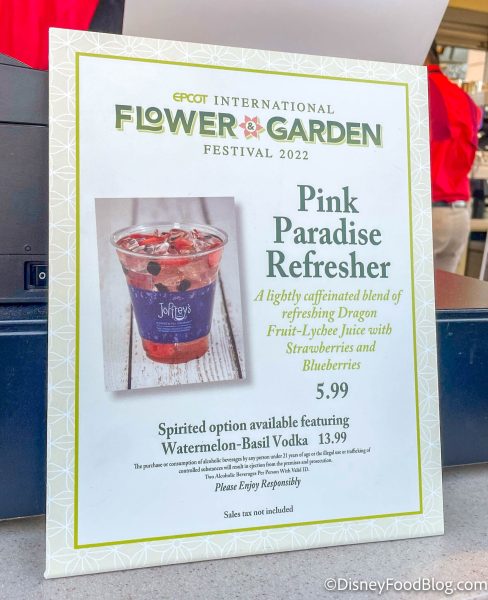 If you head to the World Showcase Joffrey’s (right at the entrance of World Showcase), you’ll find the Pink Paradise Refresher. This is a lightly caffeinated blend of refreshing dragon fruit–lychee juice with strawberries and blueberries. It’s available for $5.99, and you can get it with Watermelon-Basil Vodka for $13.99.