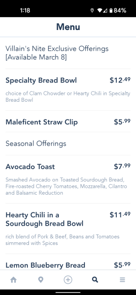 The Pacific Wharf Cafe will be offering up a Specialty Bread Bowl for $12.49, which will be your choice of Clam Chowder or Hearty Chili in a Specialty Bread Bowl. This is another location to grab that Maleficent Straw Clip.