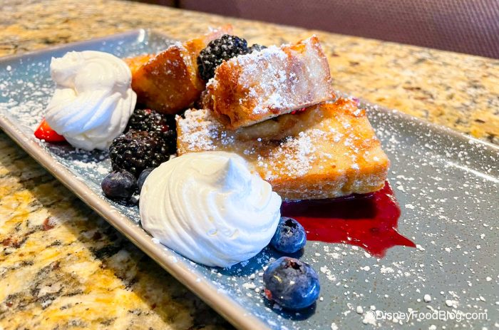 Of course, we also had to order up the Bread Pudding French Toast too because who doesn’t love dessert for breakfast, amiright? It costs $16 and includes three slices of bread pudding french toast topped with Fresh Berries, Powdered Sugar, and Whipped Cream.
