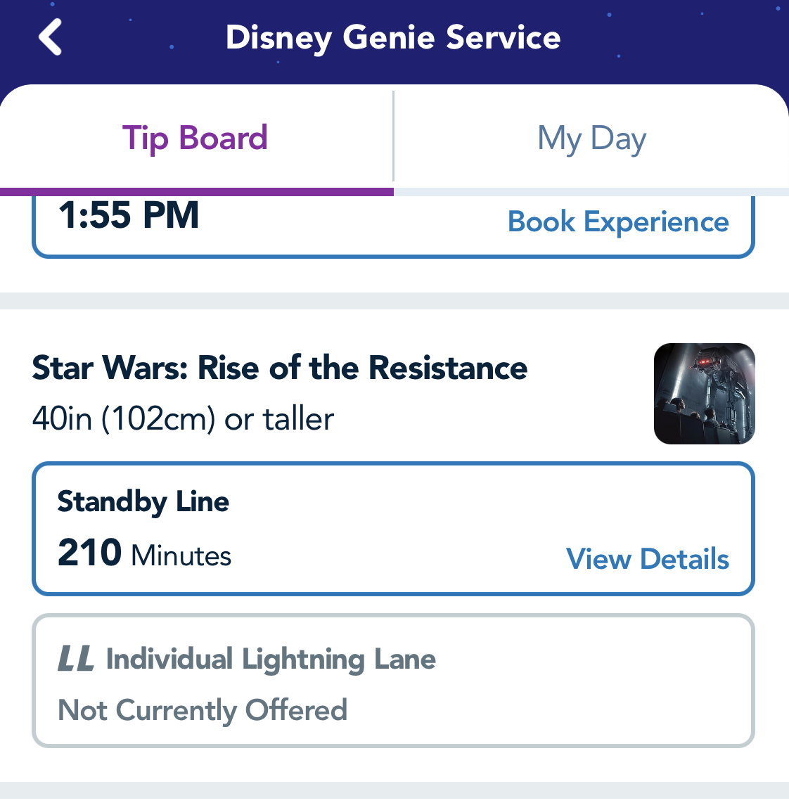 Also note that the Genie+ portion of the My Disney Experience app showed that Lightning Lanes were “not currently offered” for Rise of the Resistance. These have been selling out quickly in the mornings, so if getting a Lightning Lane for this ride is a top priority, you’ll want to snatch it up as SOON as you can.