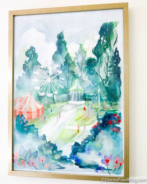 The main room area has two beds, a dresser and TV, and a couch that converts into a daybed. Above the couch were some gorgeous watercolor paintings depicting a scene from the movie!