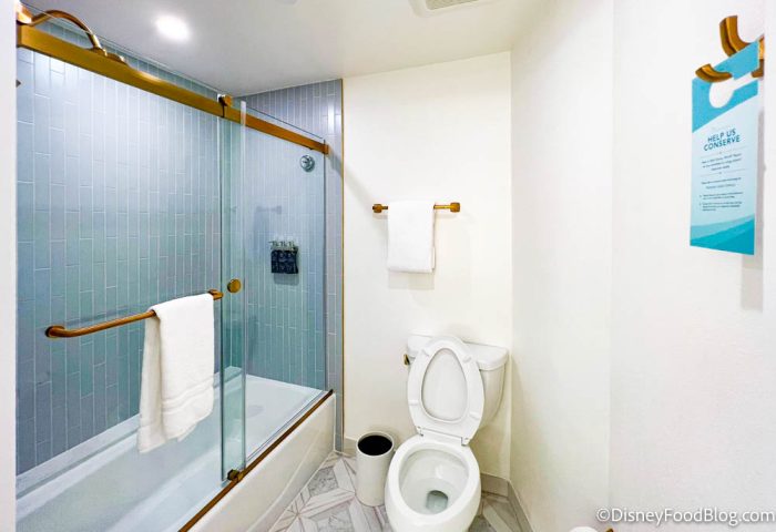The water closet has a shower/tub combo and more gold-toned fixtures.