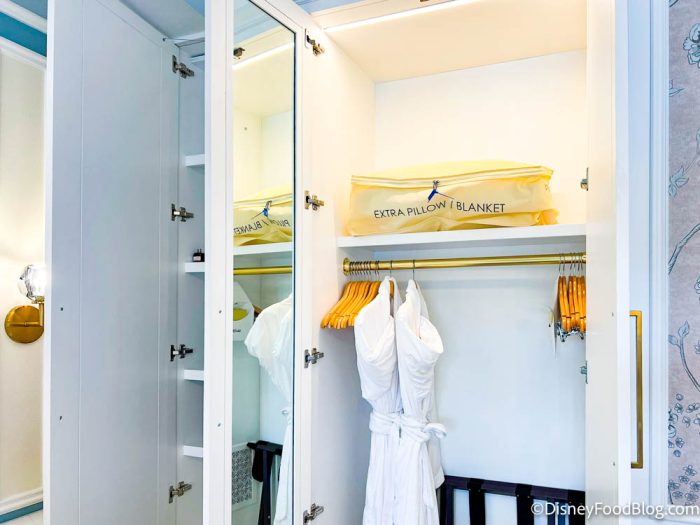 The large cabinet beside the beds opens for more storage space, and you can find a couple of robes and some extra pillows and blankets inside. Just behind these cabinets is a coffee station with a cabinet that opens up as a small fridge.