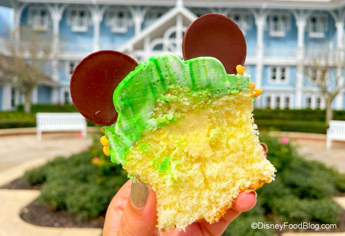 So we’re doing what we do — we’re trying them! Let’s head on over to Beach Club Marketplace at Disney’s Beach Club Resort to try the St. Patrick’s Cupcake there. This is a simple Vanilla Cupcake cored and filled with Vanilla Buttercream Frosting and topped with more Vanilla Buttercream Frosting and Festive Sprinkles. Oh, and it’s got Milk Chocolate Mickey Ears!