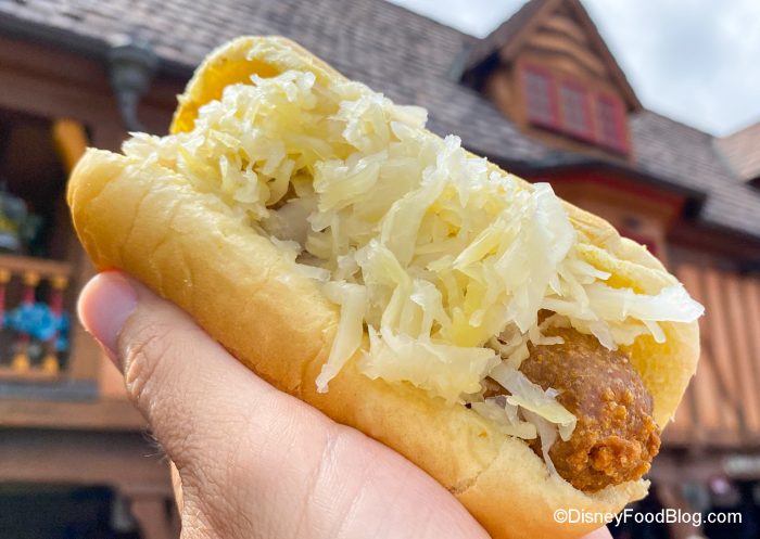 Do you see the differences here? First, it was served to us without the sauerkraut. When we asked, a Cast Member got us a side of sauerkraut. But the big thing here is that we were promised a pretzel bun, and instead we were served a regular hot dog bun.