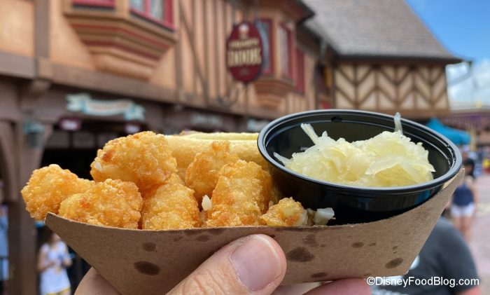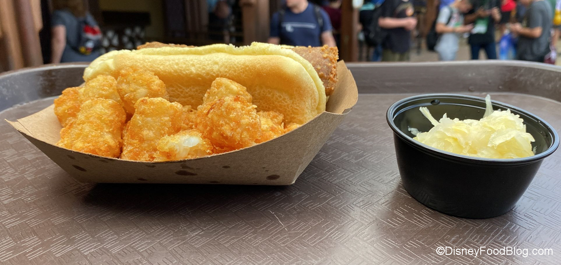 All of that aside, we could’ve forgiven the lack of toppings and pretzel bun, but according to our plant based reporter, the vegan brat was pretty dry — we’ve had way better vegan sausages at other places at Disney World (most notably at B.B. Wolfe’s Sausage Co.). The brat had very little actual flavor — the sauerkraut does all the heavy lifting here. We did grab some packets of Spicy Brown Mustard, which helped…a little.