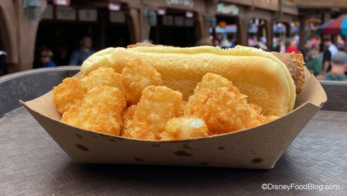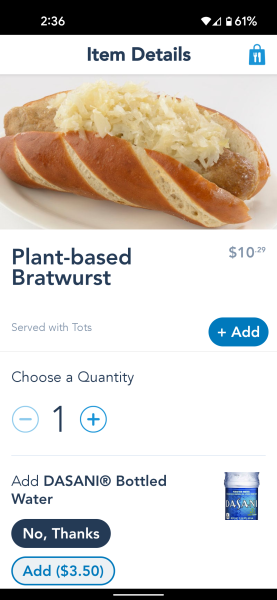 The brat is $10.29, but if you’re looking for something that packs a more flavorful punch, we’d probably recommend considering some of the other plant-based options at Magic Kingdom, like the Plant-Based Dog at Casey’s Corner.
