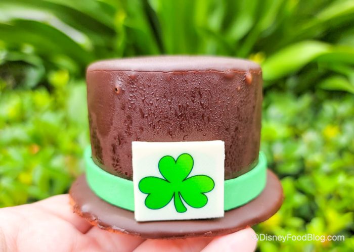 With St. Patrick’s Day right around the corner, we’re trying out all the green treats at Disney World, including one shaped like a Hat from Gasparilla Island Grill! The St. Patty’s Day Hat is made with a shortbread cookie topped with a hat made from Caramel-Irish Cream mousse and chocolate cake, covered in milk chocolate with a white chocolate ribbon and shamrock!
