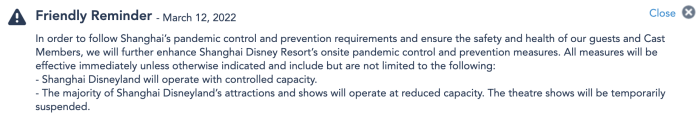 Up to this point, Shanghai Disney Resort has operated with fewer COVID-19 restrictions (requiring that guests wear face masks and maintain physical distance) and closed down for a short period of time in October 2021 in relation to the pandemic.